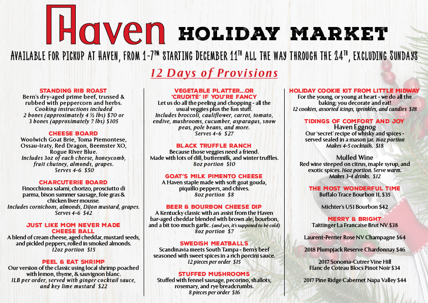 Available for pick up at Haven from 1-7PM starting December 11th through December 24th (excluding Sundays)